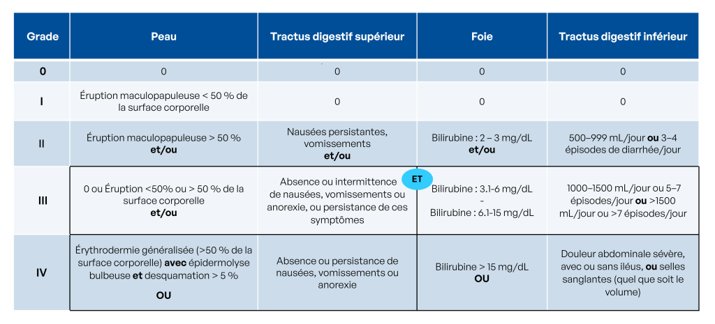 La gravité de la GvHD est évaluée sur une échelle allant de 0 (pas de réaction) à 4 (réaction sévère) :