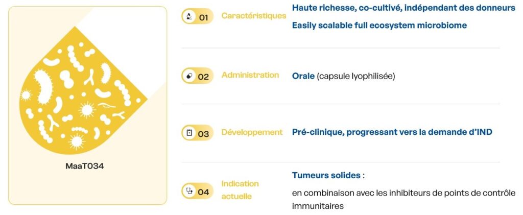 MaaT034, the first-in-class co-cultured product, is aiming at optimizing intestinal microbiome functions prior to and during immunotherapy in major oncology indications, and become a (neo)-adjuvant therapy across ICI therapies, leading to better survival in cancer patients. The objective of MaaT Pharma is to develop MaaT034 as tumor-agnostic adjunctive therapies to ICI (i.e. administration before and in combination with ICI whatever the type of cancer) leading to improved clinical outcomes and lower incidence of complications than using ICI alone.